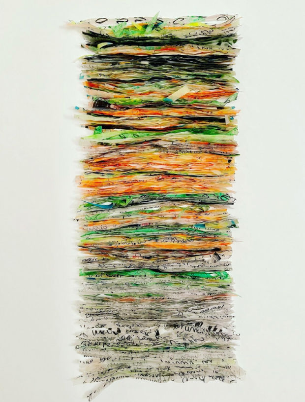 The Berlin-based German-Argentine artist Sofia Nordmann presents philosophical content with her own technique and aesthetics. She playfully cuts up or tears up her handwritten philosophical writings, intimate love letters, her own pictures and drawings, family photos, antique maps and so on, in order to then construct three-dimensional collages from them. By concealing the original content, it draws attention to this and points out the importance and beauty of the invisible. Her wall objects consist of light-flooded, translucent paper layers, snippets and strips, which open up more hidden color spaces the more intensively they are viewed. The strong suggestive power of her works is an invitation to a sometimes deep, sometimes funny journey of discovery into her own world of thought.